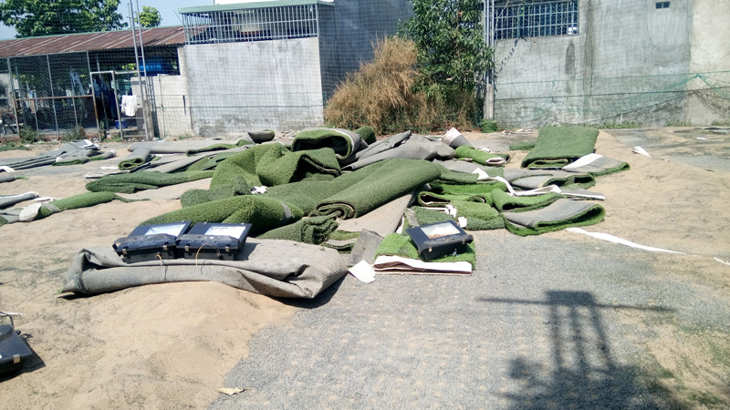 ( Hiện trường đang tháo dỡ cỏ nhân tạo củ trên 1 sân bóng )