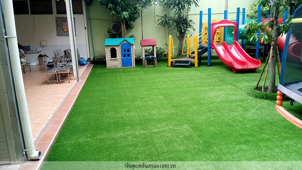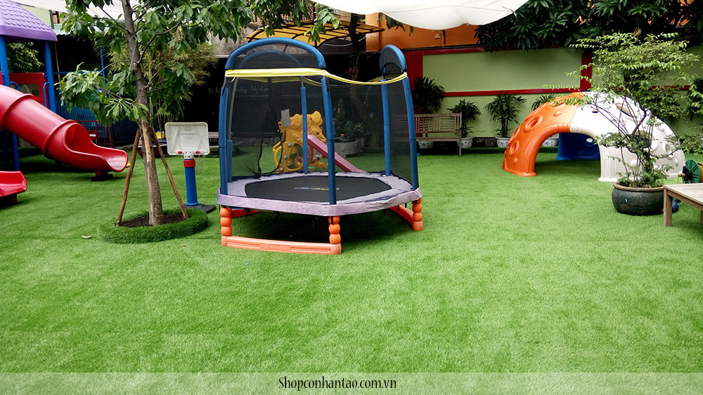 Sân trường là nơi để tổ chức các hoạt động ngoại khóa như giao lưu văn nghệ, thể dục thể thao, các trò chơi. Yếu tố sạch và an toàn cũng được nhà trường và các bậc phụ huynh quan tâm hàng đầu, sử dụng vật liệu gì lót sân trường, trồng cỏ tự nhiên hay lót gạch....đa phần nhiều trường lót gạch và lót thảm nhựa để cho vui chơi sạch sẽ hơn. Nhưng nhược điểm là độ cứng, độ ma sát dễ làm tổn thương khi tham gia vui chơi, đặc biệt là ở những trường mầm non, các bé rất hiếu động, ham vui nên thường xảy ra trầy xước. Để giải quyết vấn đề này, cỏ nhân tạo sân vườn sẽ giúp bạn: Cỏ nhân tạo lót trường mầm non montesori quận 2 có chất lượng rất tốt, được làm từ sợi PP và PE thân thiện với môi trường, không ảnh hướng đến sức khỏe của các học sinh. Cỏ nhân tạo có độ mềm và êm chống trơn trượt, trầy xước rất tốt. Nắm bắt được nhu cầu tình hình sân chơi tại các trường mẫu giáo ở Việt Nam vẫn còn thiếu thốn, đặc biệt là ở các khu thành phố lớn các bé không có khoảng sân chơi an toàn nên các trường học, mẫu giáo đã thực hiện lắp đặt sân chơi cỏ nhân tạo hiện đại để tạo sân chơi lành mạnh cho các em đến học tại trường.