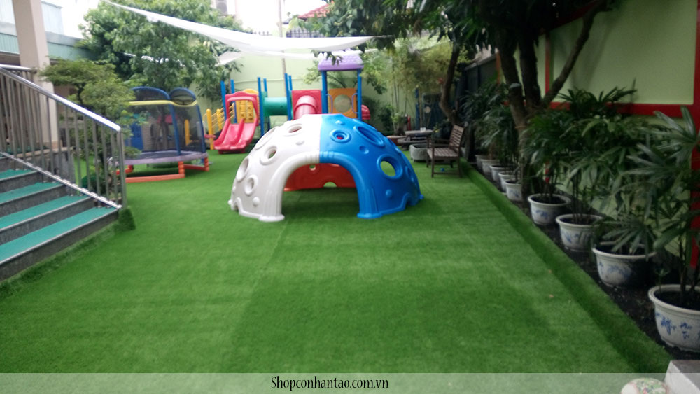 Trường mầm non quốc tế IPS Biên Hòa Đồng Nai, sử dụng cỏ nhân tạo làm sân chơi cho các bé. Cỏ nhân tạo lót trường mầm non BamBi Biên Hòa Đồng Nai cũng đã sử dụng cỏ nhân tạo lót sân chơi cho các bé, trong giờ thể dục các bé rất thích vui đùa, không sợ dơ bẩn, trơn trợt như xưa.
