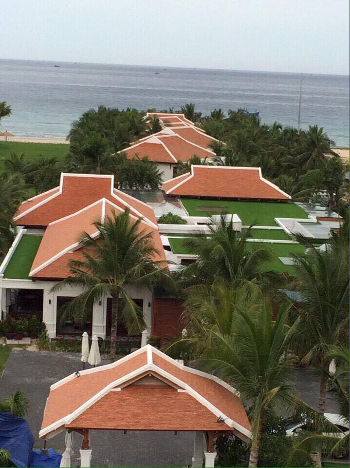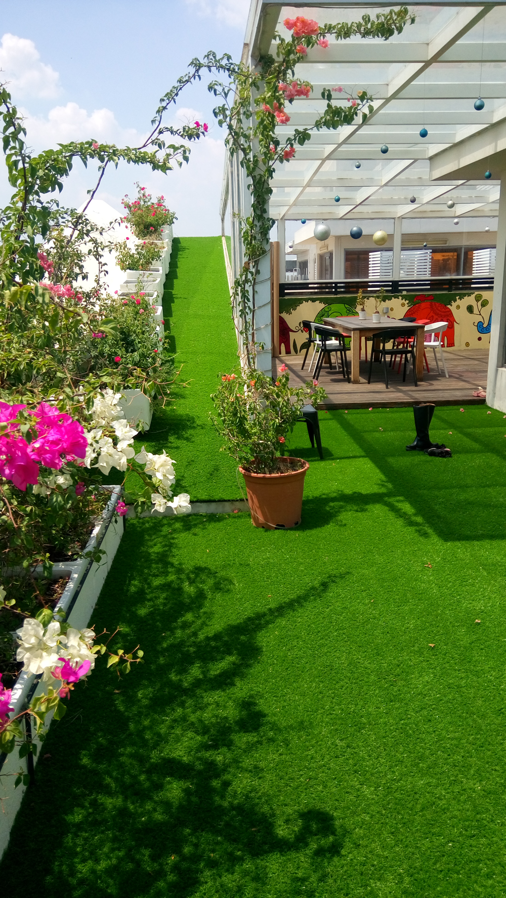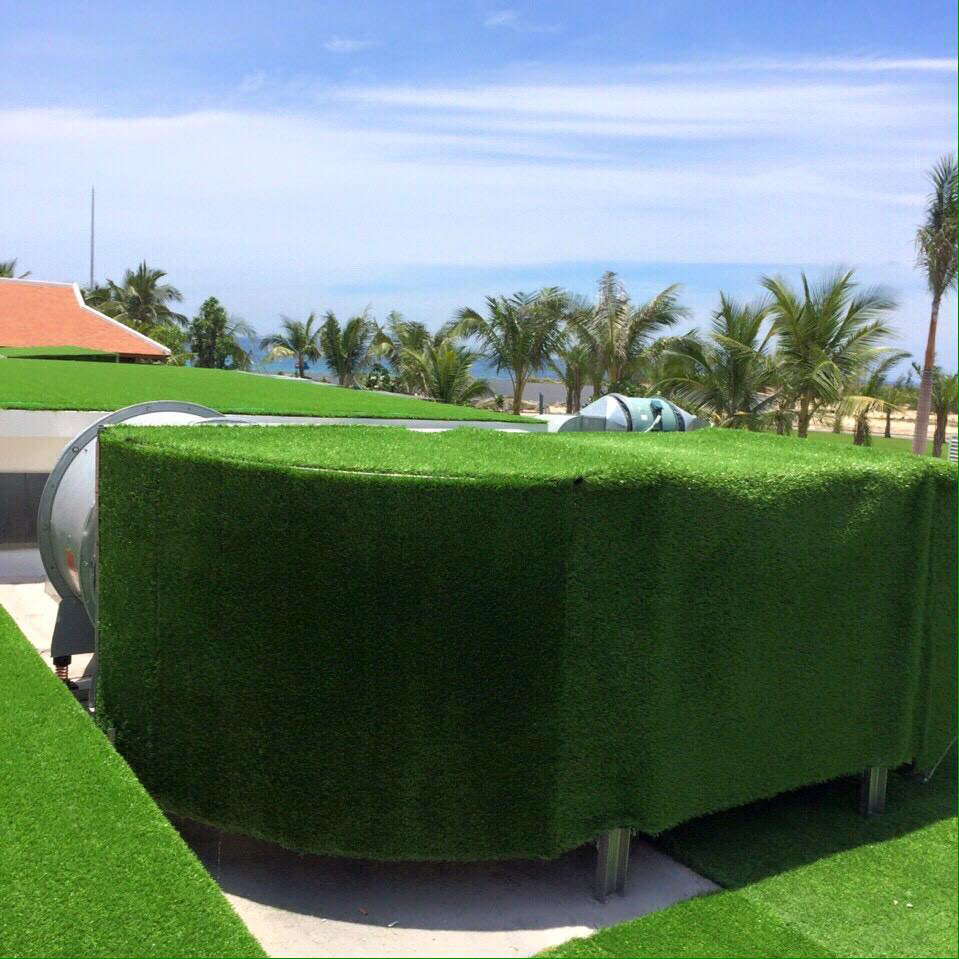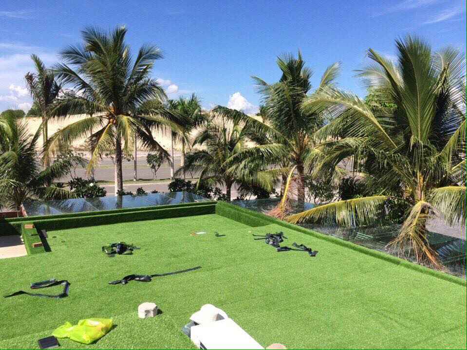 Cỏ nhân tạo lót sân thượng khách sạn, cỏ nhân tạo sân vườn làm tiểu cảnh, cỏ nhân tạo lót ban công lối đi. Ngày nay việc sử dụng cỏ nhân tạo để thay thế cỏ tự nhiên ngày càng phổ biến, với tính ưu việt về công năng cũng như tiết kiệm tối đa về chi phí chăm sóc bảo trì, bảo dưỡng thì rõ ràng cỏ nhân tạo vượt hẳn so với cỏ tự nhiên. Cỏ nhân tạo với chi phí lắp đặt bảo trì, vệ sinh hàng tháng, hàng năm chỉ bằng 1/10 so với cỏ tự nhiên. Cỏ nhân tạo được làm từ PP và PE đã qua kiểm định kỹ càng đảm bảo an toàn sức khỏe cho người sử dụng, tuổi thọ cỏ nhân tạo trang trí rất cao từ 5 đến 10 năm. Công ty vừa mới hoàn thành xong công trình trang trí tiểu cảnh trên sân thượng bằng cỏ nhân tạo cho khách sạn The Mira Bình Dương, đây là khách sạn năm sao đầu tiên ở Bình Dương, nơi tiếp khách của cơ quan tổ chức hoạt động ở Bình Dương. Anh Tân, quản lý khách sạn chia sẽ, cỏ nhân tạo thật tiện lợi không cần phải chăm sóc bón phân hay tưới nước mà vẫn có khu vườn xanh tươi như ý, rất hài lòng với công trình vừa hoàn thành, mỗi tháng khách sạn phải tốn 10 đến 20 triệu cho tiền chăm sóc sân vườn trên sân thượng mà không hài lòng nên anh tìm đến công ty cỏ nhân tạo LG Grass để thảm cỏ nhân tạo sân thượng thay thế cỏ tự nhiên. Sau ba ngày làm việc vất vả thì khu vườn trên sân thượng kết hợp giữa cây cảnh và cỏ nhân tạo trang trí đã trở thành một khu vườn lý tưởng xanh mát tự nhiên được nhiều người khen ngơi. Cô Cúc giám đốc khách sạn The Mira được biết là người có tính thẩm mỹ cao, rất chú trọng trong việc trang trí hài hòa hợp lý và rất khó tính, nhưng Cô đã rất hài lòng với cách trang trí và lót cỏ nhân tạo trên sân thượng rất đẹp.