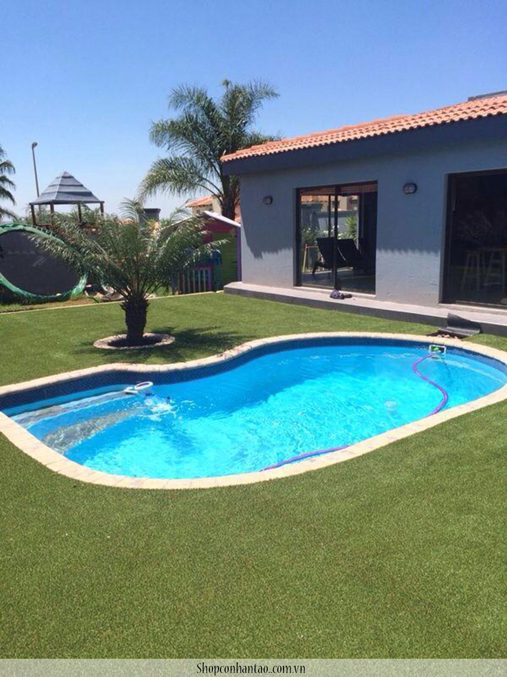 Cỏ nhân tạo lót sân vườn, khuôn viên cây xanh quanh nhà rất tiện lợi và đẹp, có nhân tạo còn được dùng để trang trí công ra vào, làm mảng xanh trước nhà rất lạ và đẹp. Thỉnh thoảng bạn cũng có thể thấy một vài quán café cũng sử dụng cỏ nhân tạo làm trang trí bảng hiệu hay lót đường đi, cảnh quan nơi mà cỏ tự nhiên không sống được